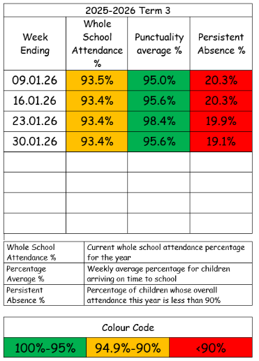 At All Souls’, we monitor and record attendance and punctuality, and want to work with our families to support them in achieving at least 95% each week. The table below records the whole school weekly attendance percentage, an average weekly punctuality percentage and persistent absence percentage for the whole school. As a school, we want to achieve 95% or above for both whole school attendance and punctuality average. Our aim is for persistent absence to be less than 5%. The colour code and categories are explained in the table below. Please feel free to contact the school, if you would like support with attendance or punctuality.