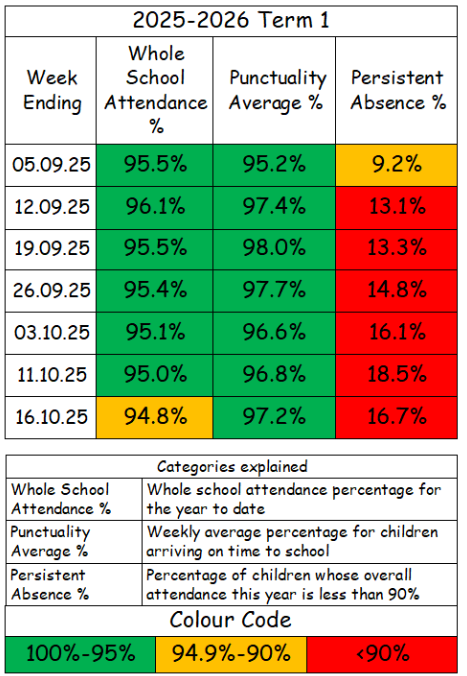 At All Souls’, we monitor and record attendance and punctuality, and want to work with our families to support them in achieving at least 95% each week. The table below records the whole school weekly attendance percentage, an average weekly punctuality percentage and persistent absence percentage for the whole school. As a school, we want to achieve 95% or above for both whole school attendance and punctuality average. Our aim is for persistent absence to be less than 5%. The colour code and categories are explained in the table below. Please feel free to contact the school, if you would like support with attendance or punctuality.